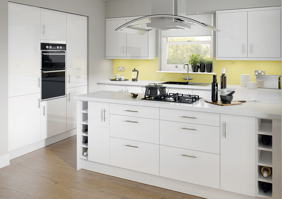 - Capri White – a slab kitchen with white gloss handleless kitchen doors and units.